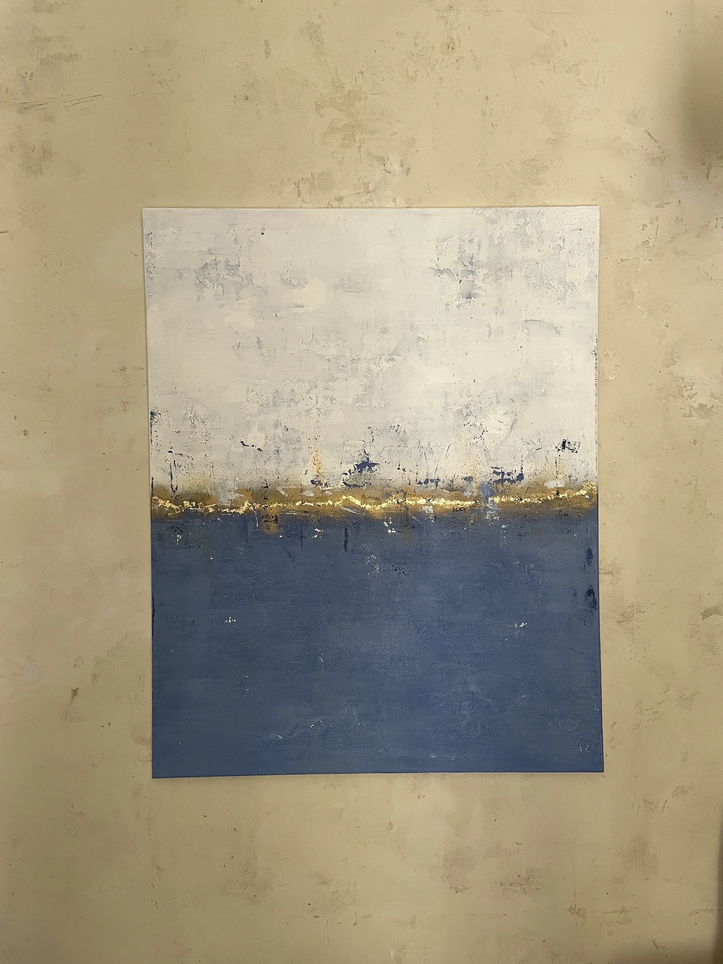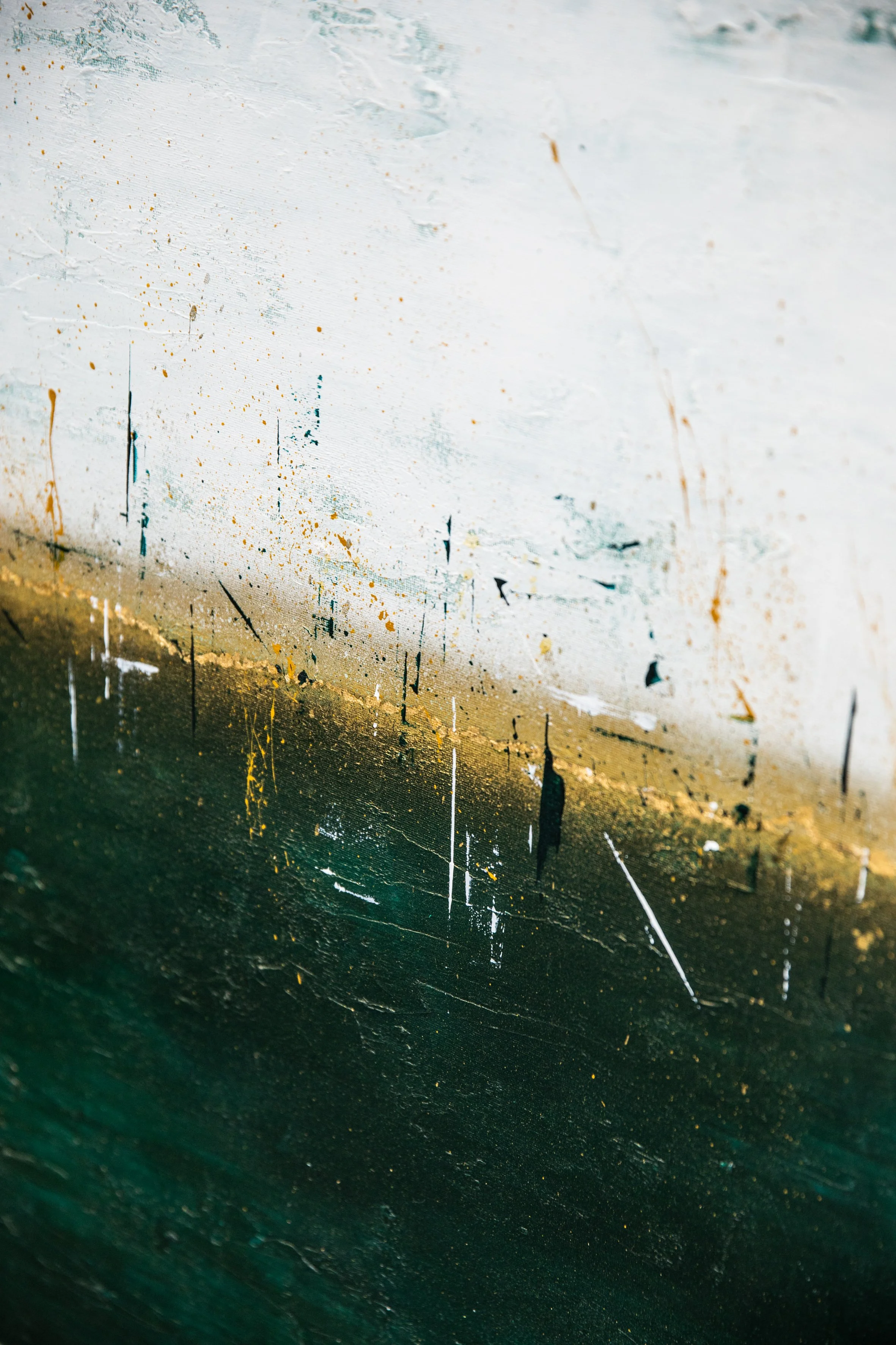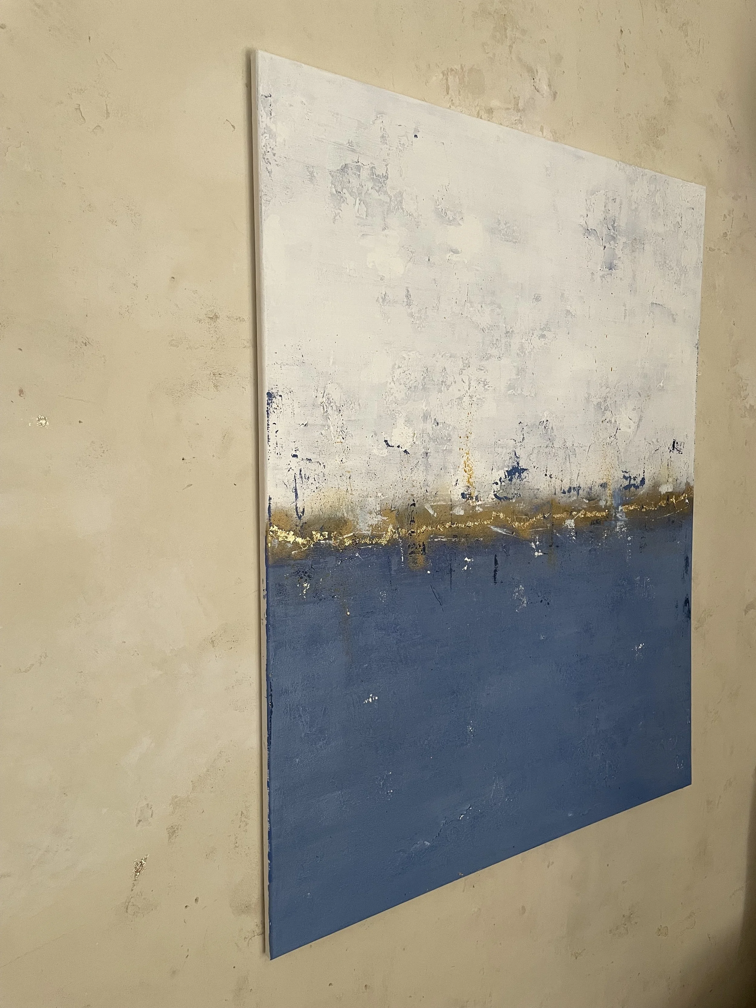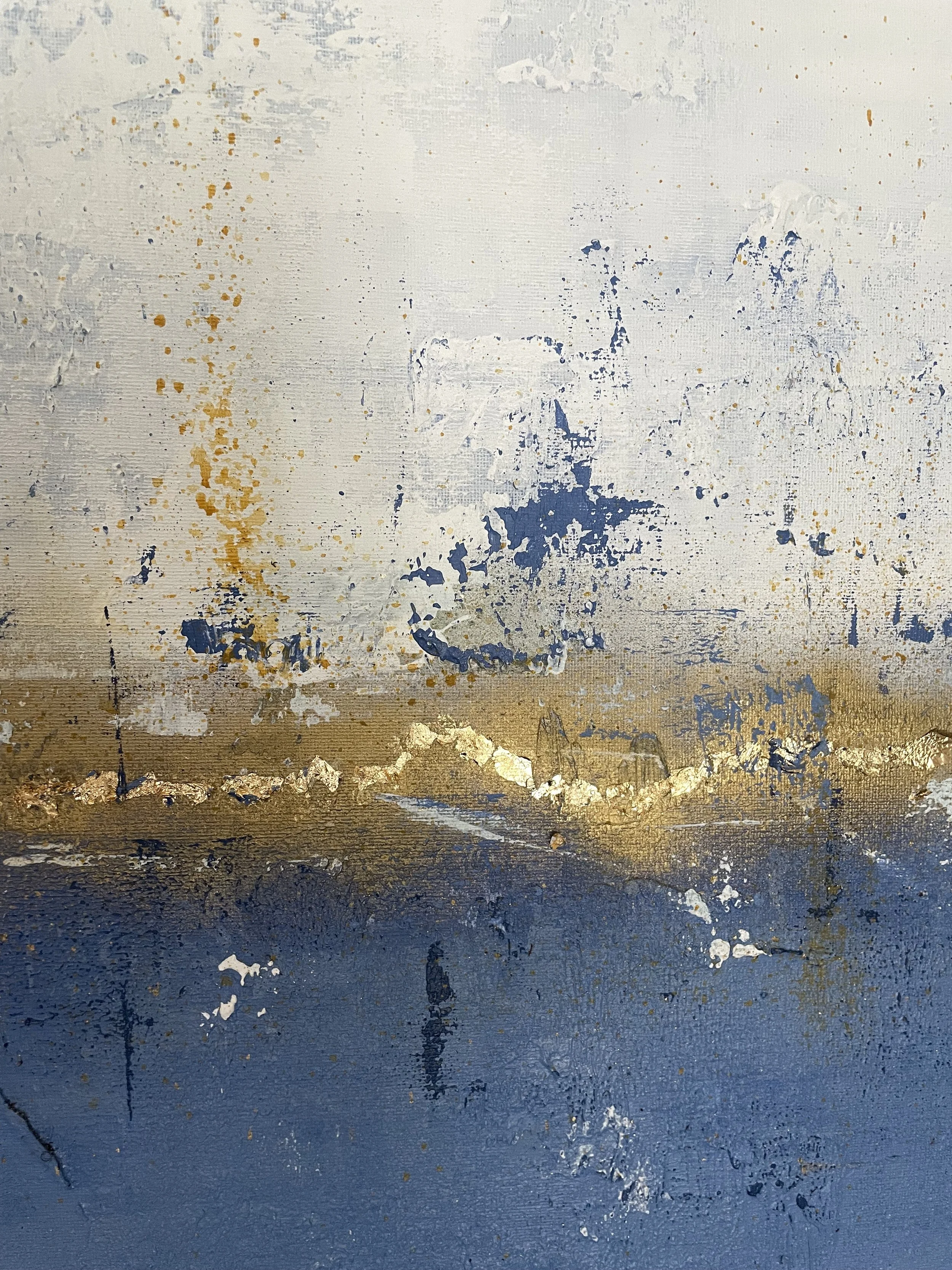 Sometimes when looking at a painting, you get the urge to reach out and touch it; to feel the texture, the layered paint strokes beneath your fingertips and that’s the case with this collection. Exploring depth and the richness of colour, again the sea and sky inspired me. I varied the colour palette depending on my mood, hoping to ignite the feelings of reflective contentment that I had when painting. In some paintings I’m transported to hot sun kissed summer days at the beach, in others I’m lost looking at a stormy sea, mesmerised by the repetitive sound of waves crashing on the shore.